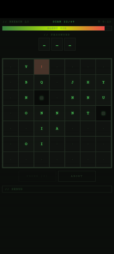 Avoid alert nodes. Alert nodes corrupt the signal around them — clean signal only exists away from alerts. Lock in a correct letter to reset the alert meter.