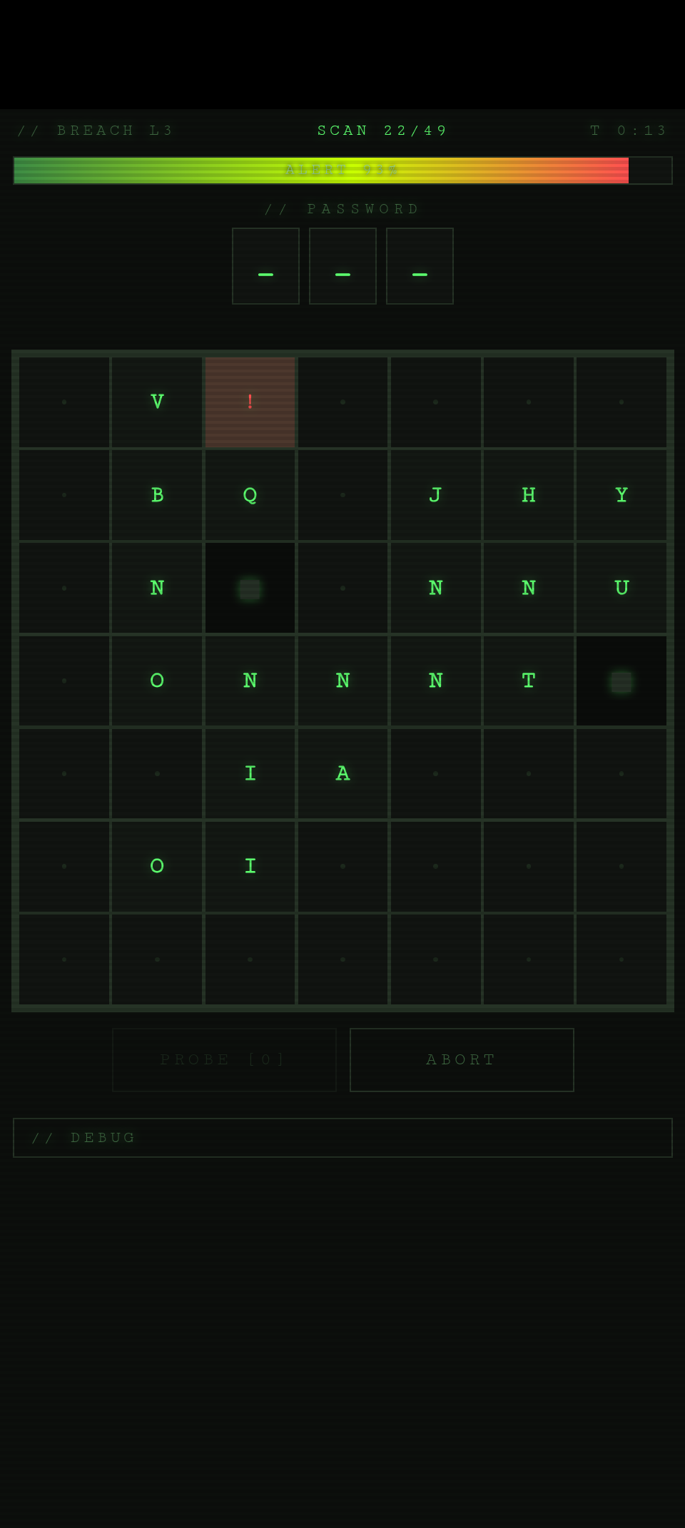 Reveal tiles to map the node grid. Clustered repeated letters mark password characters. Rarer letters come first in the password, more common letters come later.